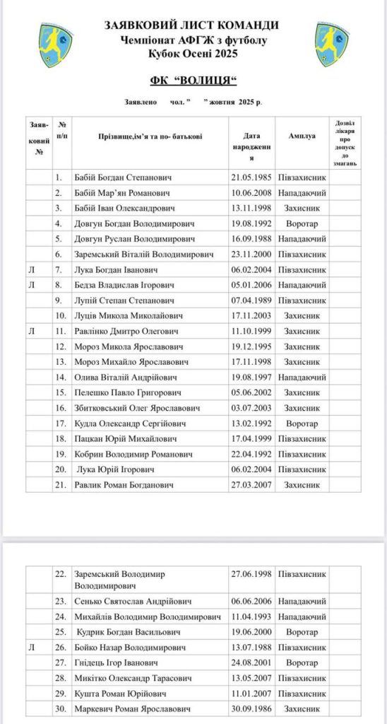 ФК Волиця ЛігиКубок Весни, Кубок "Все буде Україна", Кубок Осені, Кубок Рава-Руської ТГ, Кубок "Разом до перемоги", Розточчя, Футбол. Вища лігаСезони2023, 2023-2024, 2024, 2024-2025, 2025 Результати 9 Листопада, 2025 1 - 4 N/A ФК Панчишини — ФК Волиця 2 Листопада, 2025 2 - 2 (пен. 4-2) N/A ФК Волиця — “Сокіл” Мокротин 19 Жовтня, 2025 0 - 3 N/A ФК Замок — ФК Волиця 12 Жовтня, 2025 0 - 1 N/A ФК Волиця — “Шахтар” Кулява/Любеля 5 Жовтня, 2025 2 - 0 N/A ФК Липник — ФК Волиця 21 Вересня, 2025 5 - 0 N/A ФК Волиця — ФК Хитрейки 14 Вересня, 2025 4 - 0 N/A ФК Волиця — Вʼязова 7 Вересня, 2025 5 - 1 N/A ФК Волиця — ФК Липник 31 Серпня, 2025 2 - 4 N/A ФК Волиця — “Юність” Гійче 24 Серпня, 2025 1 - 3 N/A ФК Волиця — ФК Синьковичі 17 Серпня, 2025 0 - 2 N/A ФК Волиця — ФК Поріцьки 10 Серпня, 2025 1 - 2 N/A ФК Волиця — ФК Городжів 3 Серпня, 2025 2 - 3 N/A ФК Синьковичі — ФК Волиця 20 Липня, 2025 4 - 1 N/A ФК Поріцьки — ФК Волиця 13 Липня, 2025 0 - 4 N/A ФК Хитрейки — ФК Волиця 6 Липня, 2025 1 - 2 N/A Вʼязова — ФК Волиця 29 Червня, 2025 0 - 0 N/A ФК Липник — ФК Волиця 22 Червня, 2025 1 - 2 N/A “Юність” Гійче — ФК Волиця 1 Червня, 2025 0 - 0 N/A ФК Городжів — ФК Волиця 18 Травня, 2025 2 - 0 N/A “Юність” Гійче — ФК Волиця 27 Квітня, 2025 1 - 4 N/A ФК Замок — ФК Волиця 22 Квітня, 2025 1 - 2 N/A “Юність” Гійче — ФК Волиця 13 Квітня, 2025 0 - 2 N/A ФК Синьковичі — ФК Волиця 30 Березня, 2025 3 - 1 N/A ФК Волиця — ФК Середкевичі 23 Березня, 2025 2 - 5 N/A ФК Добросин — ФК Волиця 16 Березня, 2025 4 - 4 (пен. 3:0) N/A ФК Волиця — ФК Річки 9 Березня, 2025 8 - 0 N/A ФК Волиця — ФК Середкевичі 2 Березня, 2025 1 - 7 N/A ФК Добросин — ФК Волиця 23 Лютого, 2025 2 - 3 N/A ФК Волиця — ФК Городжів 9 Лютого, 2025 2 - 3 N/A ФК «Вовковиця» — ФК Волиця 26 Січня, 2025 1 - 6 N/A ФК Волиця — ФК Замок 19 Січня, 2025 0 - 3 (т.п.) N/A ФК Рава — ФК Волиця 12 Січня, 2025 1 - 4 N/A ФК Хитрейки — ФК Волиця 5 Січня, 2025 2 - 6 N/A ФК Волиця — ФК Рава U-19 29 Грудня, 2024 5 - 2 N/A ФК Волиця — Немирів 22 Грудня, 2024 2 - 3 N/A ФК Волиця — ФК Липник 15 Грудня, 2024 12 - 1 N/A ФК Волиця — ФК Річки 8 Грудня, 2024 3 - 3 N/A ФК Волиця — “Юність” Гійче 3 Листопада, 2024 1 - 1 (пен. 2:4) N/A ФК Волиця — ФК Хитрейки 27 Жовтня, 2024 2 - 2 N/A ФК Волиця — ФК Річки 20 Жовтня, 2024 3 - 2 N/A ФК Замок — ФК Волиця 6 Жовтня, 2024 3 - 2 N/A “Імпульс” Лавриків — ФК Волиця 29 Вересня, 2024 1 - 3 N/A “Юність” Гійче — ФК Волиця 23 Квітня, 2024 3 - 1 N/A ФК Синьковичі — ФК Волиця 21 Квітня, 2024 2 - 2 N/A ФК Волиця — ФК Липник 14 Квітня, 2024 1 - 2 N/A ФК Волиця — “Юність” Гійче 31 Березня, 2024 1 - 0 N/A ФК Добросин — ФК Волиця 16 Березня, 2024 7 - 2 N/A ФК Липник — ФК Волиця 3 Березня, 2024 3 - 2 N/A ФК Волиця — ФК Друзі 25 Лютого, 2024 2 - 2 N/A ФК Волиця — ФК Рава U-17 18 Лютого, 2024 3 - 3 N/A ФК Волиця — ФК Волиця-2 11 Лютого, 2024 0 - 2 N/A ФК «Вовковиця» — ФК Волиця 4 Лютого, 2024 2 - 5 N/A ФК Хитрейки — ФК Волиця 28 Січня, 2024 6 - 3 N/A ФК Волиця — ФК Середкевичі 21 Січня, 2024 2 - 11 N/A “Юність” Гійче — ФК Волиця 6 Січня, 2024 3 - 2 N/A ФК Волиця — ФК Замок 24 Грудня, 2023 2 - 4 N/A ФК Панчишини — ФК Волиця 16 Грудня, 2023 4 - 3 N/A ФК Магерів — ФК Волиця 12 Листопада, 2023 1 - 0 N/A “Шахтар” Кулява/Любеля — ФК Волиця 5 Листопада, 2023 0 - 0 N/A “Юність” Гійче — ФК Волиця 29 Жовтня, 2023 2 - 0 N/A ФК Липник — ФК Волиця 22 Жовтня, 2023 3 - 2 N/A ФК Волиця — ФК Річки 8 Жовтня, 2023 3 - 2 N/A ФК Синьковичі — ФК Волиця 23 Квітня, 2023 3 - 5 N/A ФК Добросин — ФК Волиця 9 Квітня, 2023 2 - 2 (пен. 3-2) N/A ФК Волиця — ФК Панчишини 2 Квітня, 2023 2 - 3 N/A ФК Липник — ФК Волиця 19 Березня, 2023 4 - 2 N/A ФК Волиця — ФК Замок 12 Березня, 2023 5 - 4 N/A ФК Друзі — ФК Волиця