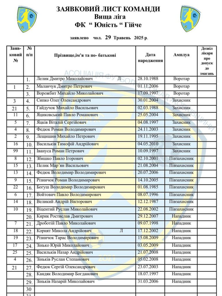 “Юність” Гійче ЛігиКубок Весни, Кубок Осені, Кубок Рава-Руської ТГ, Кубок "Разом до перемоги", Розточчя, Турнір "CUP ЗСУ", Футбол. Вища лігаСезони2022, 2023, 2023-2024, 2024, 2024-2025, 2025ГоловнаГійче Результати 21 Вересня, 2025 3 - 1 N/A ФК Синьковичі — “Юність” Гійче 14 Вересня, 2025 2 - 4 N/A “Юність” Гійче — ФК Городжів 7 Вересня, 2025 2 - 2 N/A Вʼязова — “Юність” Гійче 31 Серпня, 2025 2 - 4 N/A ФК Волиця — “Юність” Гійче 24 Серпня, 2025 4 - 0 N/A “Юність” Гійче — ФК Поріцьки 17 Серпня, 2025 0 - 1 N/A ФК Хитрейки — “Юність” Гійче 10 Серпня, 2025 3 - 1 N/A “Юність” Гійче — ФК Липник 20 Липня, 2025 3 - 4 N/A “Юність” Гійче — ФК Хитрейки 13 Липня, 2025 1 - 1 N/A “Юність” Гійче — ФК Синьковичі 6 Липня, 2025 2 - 2 N/A ФК Городжів — “Юність” Гійче 29 Червня, 2025 1 - 4 N/A “Юність” Гійче — Вʼязова 22 Червня, 2025 1 - 2 N/A “Юність” Гійче — ФК Волиця 15 Червня, 2025 0 - 3 (т.п.) N/A ФК Поріцьки — “Юність” Гійче 1 Червня, 2025 0 - 3 N/A ФК Липник — “Юність” Гійче 25 Травня, 2025 4 - 1 N/A ФК Хитрейки — “Юність” Гійче 18 Травня, 2025 2 - 0 N/A “Юність” Гійче — ФК Волиця 27 Квітня, 2025 0 - 2 N/A ФК Синьковичі — “Юність” Гійче 22 Квітня, 2025 1 - 2 N/A “Юність” Гійче — ФК Волиця 13 Квітня, 2025 0 - 2 N/A ФК Замок — “Юність” Гійче 30 Березня, 2025 5 - 2 N/A “Імпульс” Лавриків — “Юність” Гійче 23 Березня, 2025 2 - 2 (пен. 3-2) N/A “Юність” Гійче — ФК Городжів 9 Березня, 2025 5 - 1 N/A “Юність” Гійче — ФК Річки 2 Березня, 2025 5 - 0 N/A “Юність” Гійче — ФК Замок-2 23 Лютого, 2025 2 - 3 N/A “Імпульс” Лавриків — “Юність” Гійче 9 Лютого, 2025 3 - 6 N/A ФК Замок — “Юність” Гійче 26 Січня, 2025 0 - 3 (т.п.) N/A ФК Рава — “Юність” Гійче 19 Січня, 2025 1 - 5 N/A ФК Хитрейки — “Юність” Гійче 12 Січня, 2025 8 - 3 N/A ФК Рава U-19 — “Юність” Гійче 5 Січня, 2025 6 - 3 N/A “Юність” Гійче — Немирів 29 Грудня, 2024 1 - 9 N/A ФК Липник — “Юність” Гійче 22 Грудня, 2024 8 - 2 N/A “Юність” Гійче — ФК Річки 15 Грудня, 2024 2 - 6 N/A ФК «Вовковиця» — “Юність” Гійче 8 Грудня, 2024 3 - 3 N/A ФК Волиця — “Юність” Гійче 10 Листопада, 2024 3 - 2 N/A ФК Синьковичі — “Юність” Гійче 3 Листопада, 2024 4 - 1 N/A “Юність” Гійче — “Шахтар” Кулява/Любеля 27 Жовтня, 2024 2 - 2 N/A “Юність” Гійче — ФК Замок 13 Жовтня, 2024 2 - 3 N/A “Юність” Гійче — “Імпульс” Лавриків 6 Жовтня, 2024 2 - 6 N/A ФК Річки — “Юність” Гійче 29 Вересня, 2024 1 - 3 N/A “Юність” Гійче — ФК Волиця 15 Вересня, 2024 1 - 2 N/A “Юність” Гійче — ФК Добросин 8 Вересня, 2024 5 - 1 N/A “Юність” Гійче — ФК Хитрейки 1 Вересня, 2024 4 - 1 N/A “Юність” Гійче — ФК Замок 25 Серпня, 2024 0 - 1 N/A “Карпати” Бишків — “Юність” Гійче 18 Серпня, 2024 6 - 3 N/A “Юність” Гійче — ФК Городжів 11 Серпня, 2024 1 - 0 N/A ФК Синьковичі — “Юність” Гійче 4 Серпня, 2024 5 - 5 N/A “Юність” Гійче — Вʼязова 28 Липня, 2024 2 - 1 N/A “Імпульс” Лавриків — “Юність” Гійче 21 Липня, 2024 3 - 7 N/A “Юність” Гійче — ФК Гряда 14 Липня, 2024 7 - 2 N/A ФК Гряда — “Юність” Гійче 7 Липня, 2024 1 - 3 N/A “Юність” Гійче — ФК Добросин 30 Червня, 2024 4 - 7 N/A ФК Хитрейки — “Юність” Гійче 23 Червня, 2024 2 - 5 N/A ФК Замок — “Юність” Гійче 16 Червня, 2024 3 - 2 N/A “Юність” Гійче — “Карпати” Бишків 9 Червня, 2024 3 - 10 N/A ФК Городжів — “Юність” Гійче 2 Червня, 2024 1 - 3 N/A “Юність” Гійче — ФК Синьковичі 26 Травня, 2024 1 - 3 N/A Вʼязова — “Юність” Гійче 19 Травня, 2024 2 - 2 N/A “Юність” Гійче — “Імпульс” Лавриків 12 Травня, 2024 1 - 4 N/A “Юність” Гійче — ФК Гряда 7 Травня, 2024 1 - 0 N/A “Юність” Гійче — ФК Поріцьки 28 Квітня, 2024 6 - 1 N/A “Юність” Гійче — “Шахтар” Кулява/Любеля 23 Квітня, 2024 2 - 1 N/A “Юність” Гійче — ФК Добросин 14 Квітня, 2024 1 - 2 N/A ФК Волиця — “Юність” Гійче 7 Квітня, 2024 5 - 1 N/A “Юність” Гійче — ФК Синьковичі 31 Березня, 2024 1 - 1 N/A ФК Липник